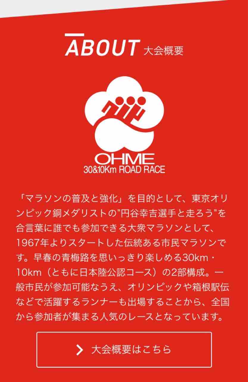 「青梅マラソン」は、15㎞の往復で、上りの15㎞+下りの15㎞ = 30㎞の大会です。最初の上り15㎞を耐え忍べば、後は楽な下りが待ってます。