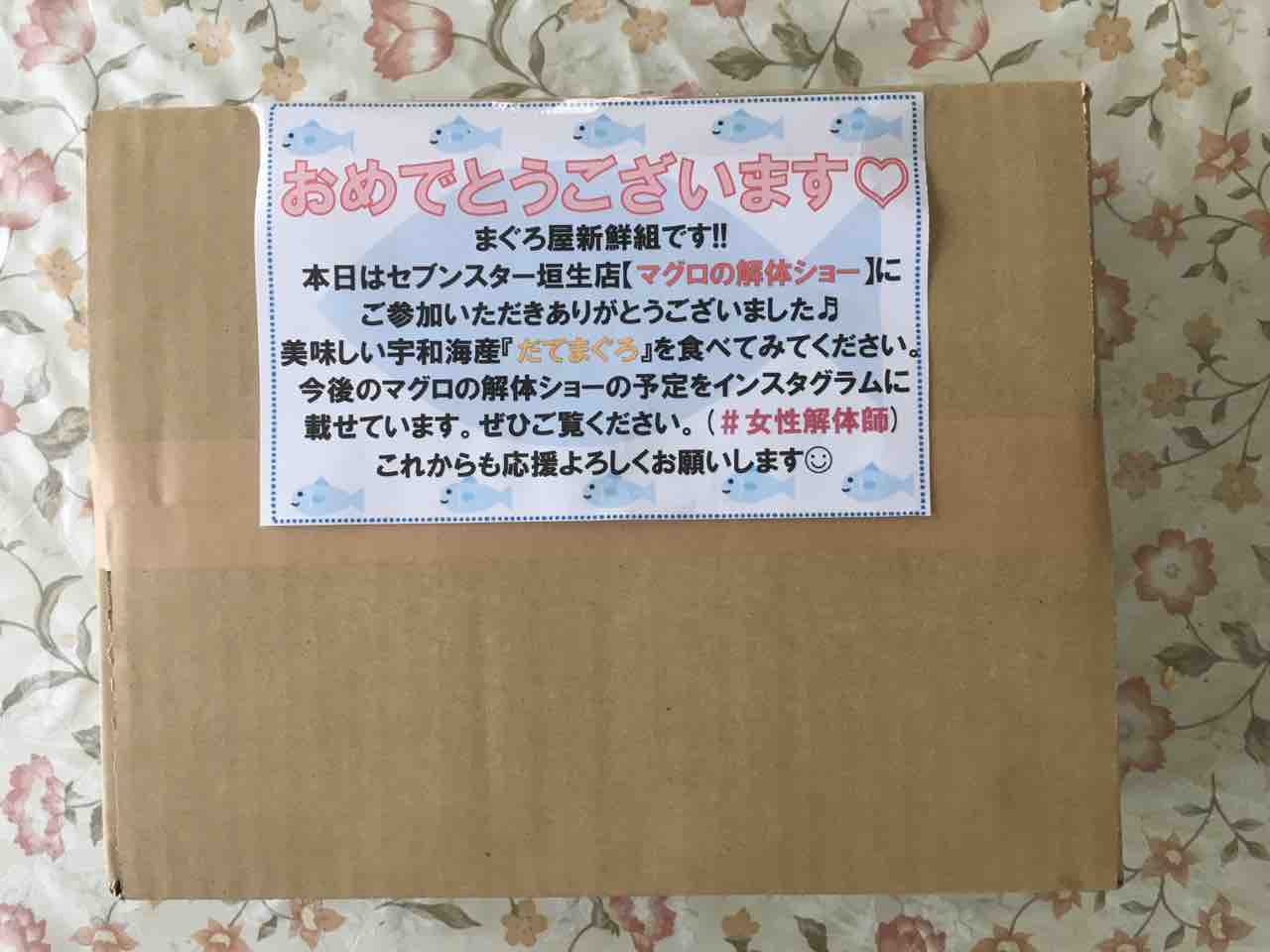 「まぐろ屋新選組」の女性解体師が実演していました。解体されるマグロは、「だてまぐろ」で愛媛県産の養殖クロマグロのブランドとのことです。結構立派なマグロで60kg弱あり、私の体重とほとんど変わりません。